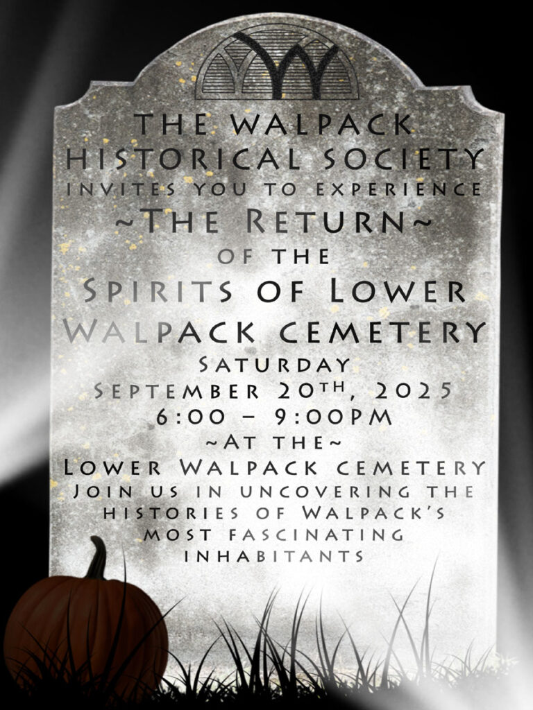 The Walpack Historical Society believes everyone has a story worth sharing. We invite you to join us for the Return of The Spirits of Lower Walpack Cemetery program on Saturday, September 20, 2025 from 6 pm – 9 pm at the Lower Walpack Cemetery. WHS members will bring to life some of Lower Walpack Cemetery’s most fascinating inhabitants. Guests will also have the opportunity to learn more about the history of the cemetery and the surrounding property; the hard work, restoration and ongoing efforts to maintain the grounds; as well the history of the Salem Oak Tree of Walpack. Those interested will have the opportunity to join guided walks to the former Rosenkrans Ferry crossing on the Delaware River.